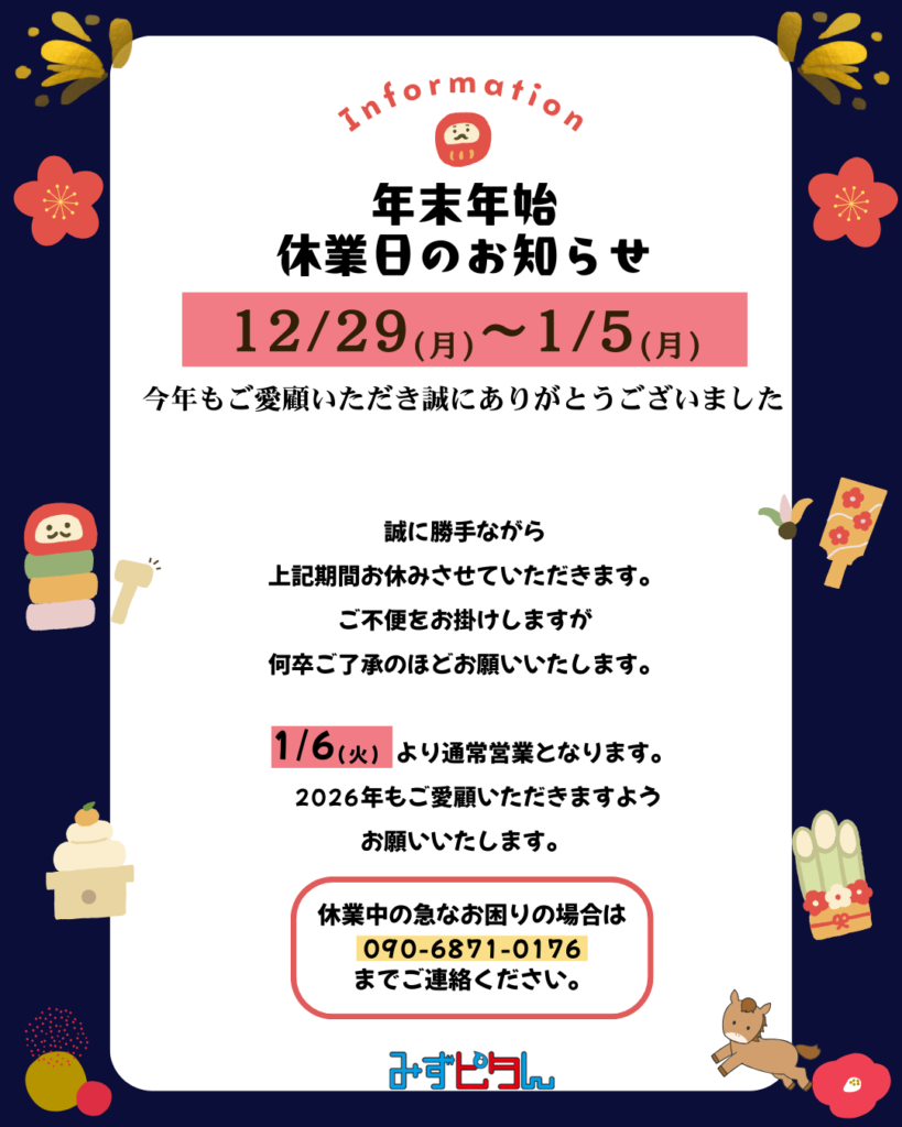 年末年始休業期間:2025年12月29日(月)~2026年1月5日(月)